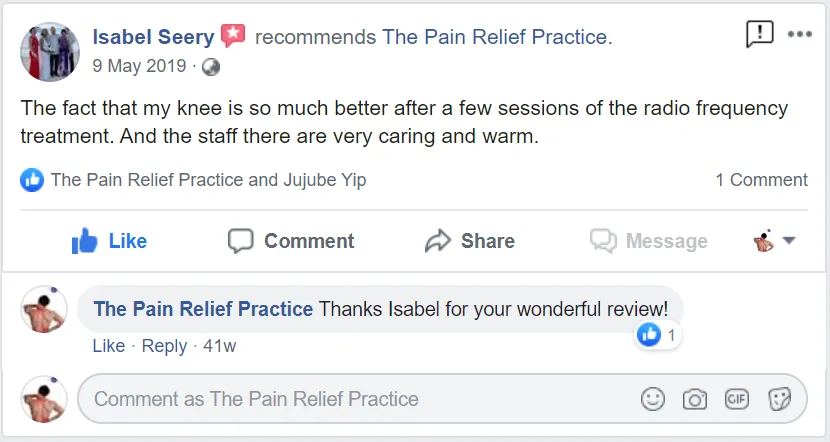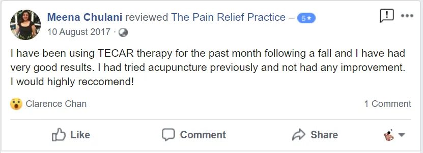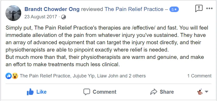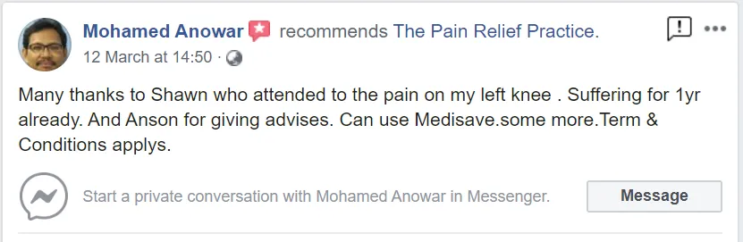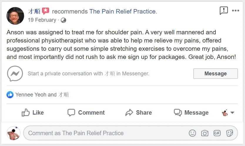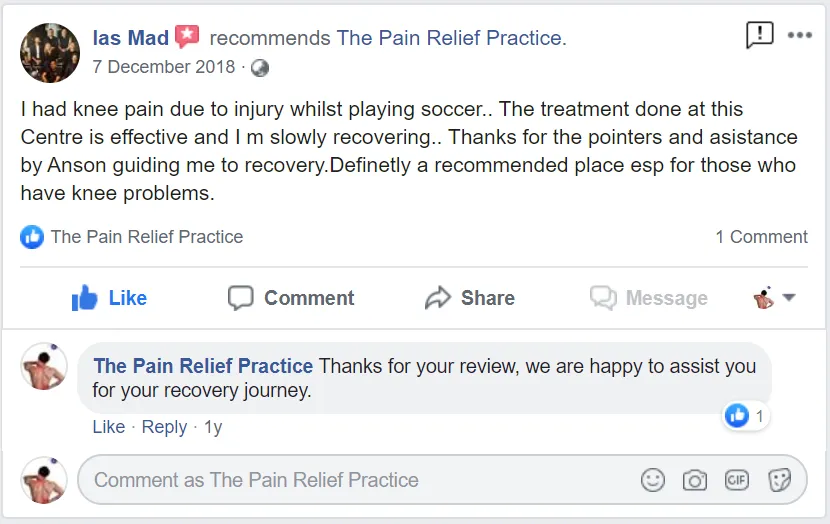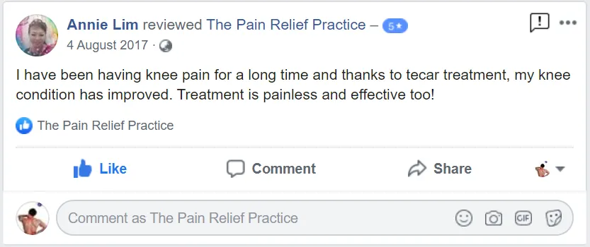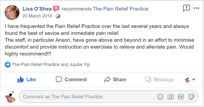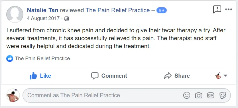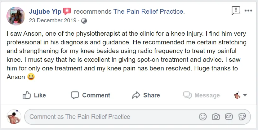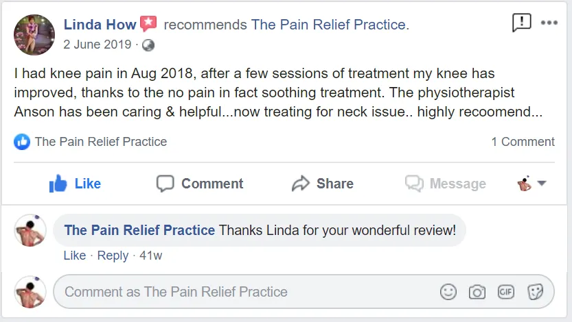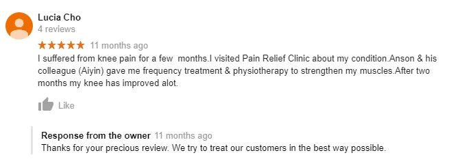 "When I first came to The Pain Relief Practice, my left knee cap was very painful. I have to bear pain with some medical plaster to relief the pain. I saw fr the Facebook by them. I called them to make an appt. When my first appt, Anson is very patient to explain the procedure and I got the first treatment with the heat therapy machine. I am very happy with the results. I have signed up another three more treatments. I strongly recommend you to come here to see them.. You will not regret it.😀."