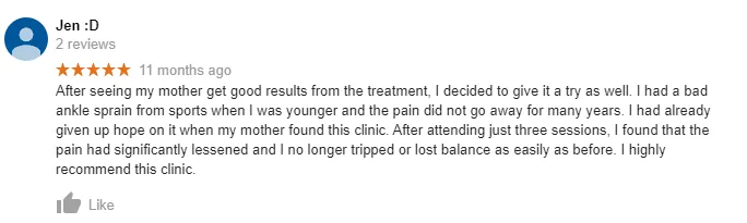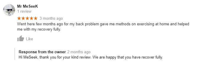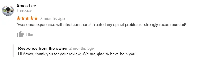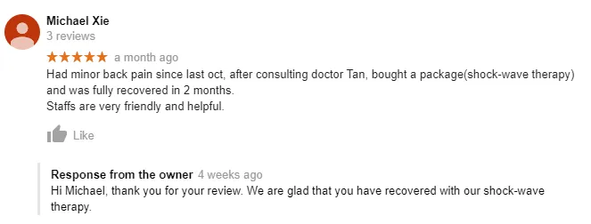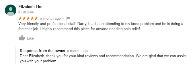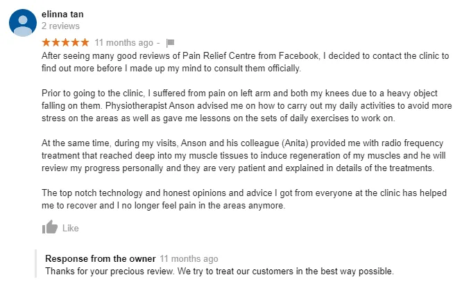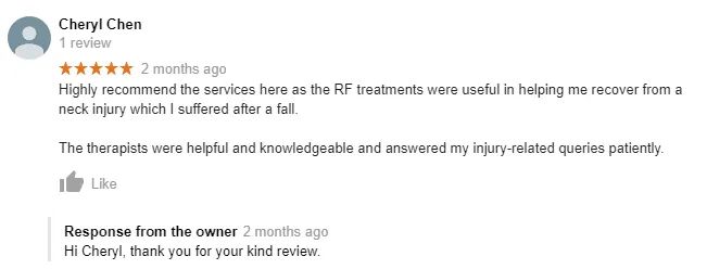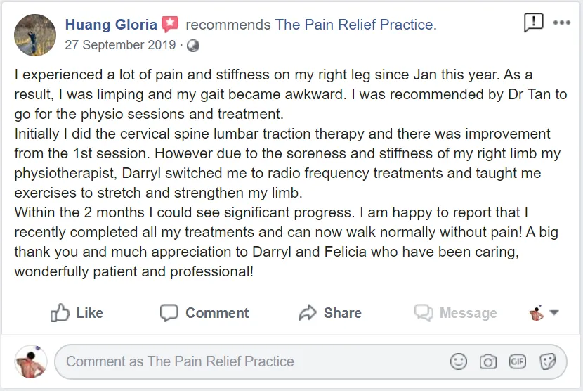 "Great experience and indeed this clinic managed to relieve my hip and leg pain in just within 2.5 weeks after 3 sessions of decompression therapy and RF therapy only. Highly recommend this place for pain relief. They are very knowledgeable and they know exactly how to treat my problem and provided the quickest form of pain relief for me. am so thankful to the team here. They are also good in teaching me some good form of exercises to build up the muscles."