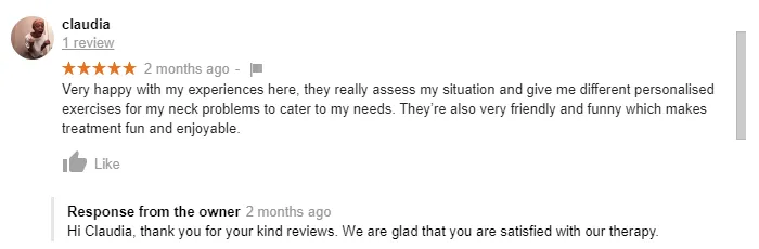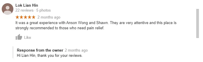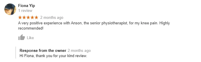 "I had knee pain in Aug 2018, after a few sessions of treatment my knee has improved, thanks to the no pain in fact soothing treatment. The physiotherapist Anson has been caring & helpful...now treating for neck issue.. highly recommend... "